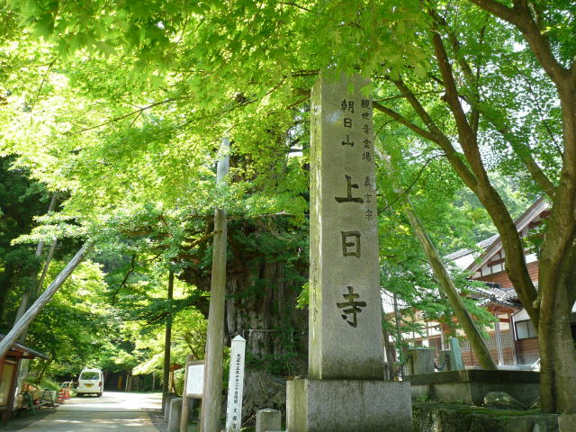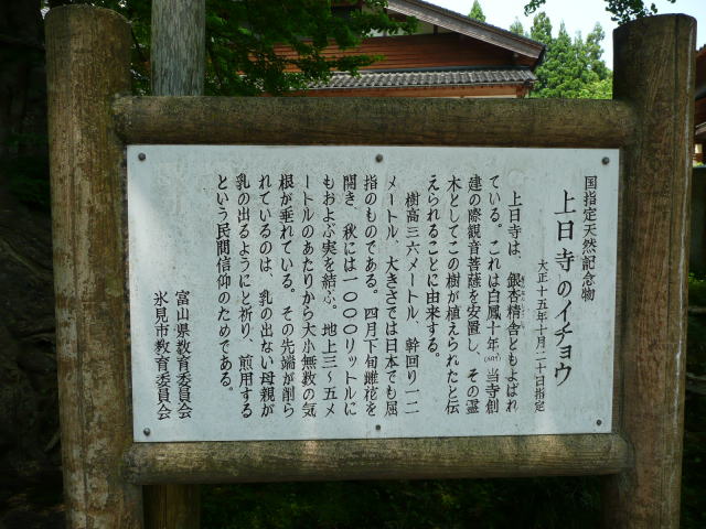 氷見市朝日山公園の登り口にある上日寺の境内に生えているイチョウです。 樹高36m、幹回り12mの巨樹で、国の天然記念物に指定されています。傍には、とやまの名水上日寺の観音菩薩霊水があります。